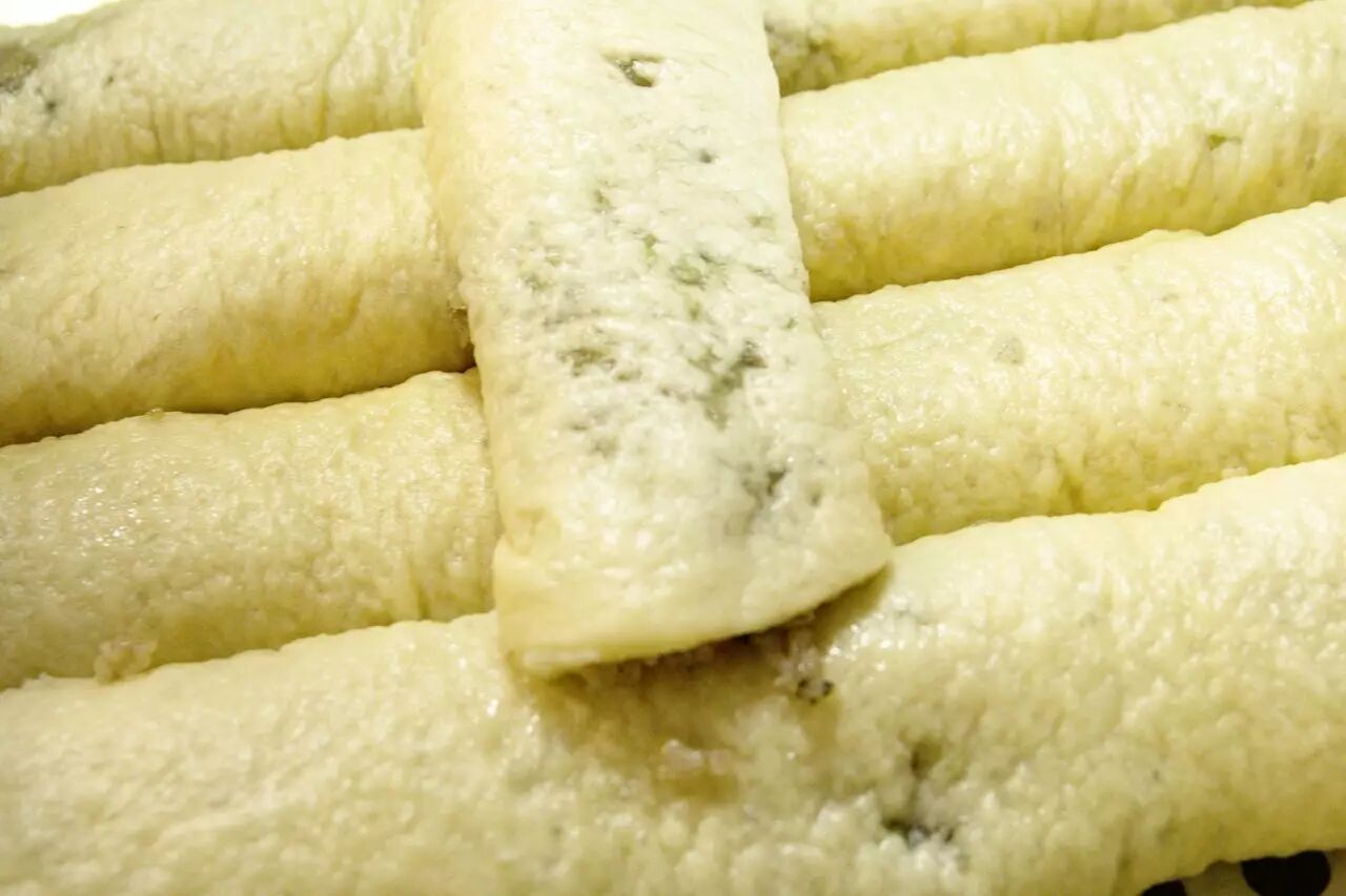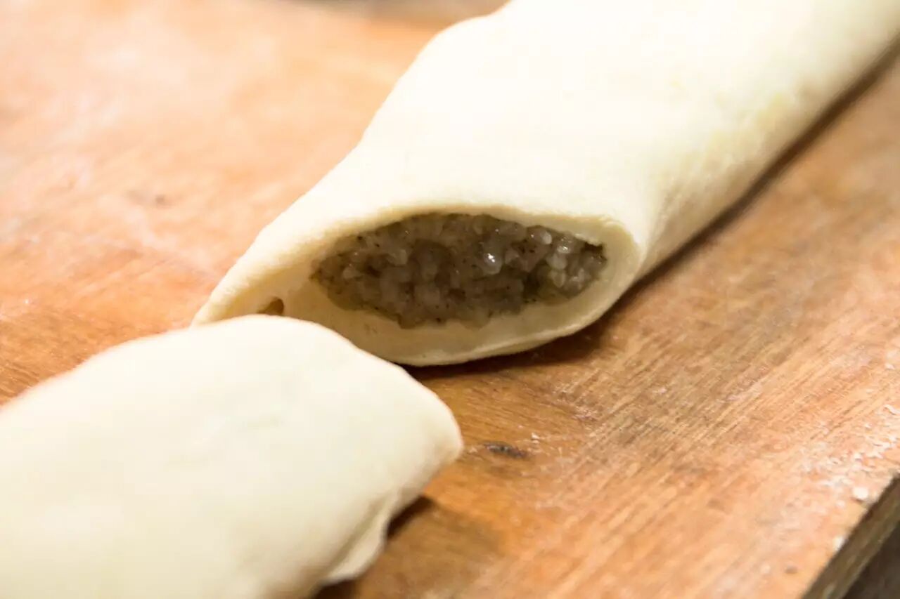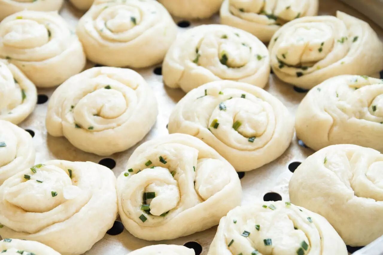 先把葱用盐水腌好放在旁边,扯一大把面粉用擀面杖擀平,然后铺上葱花匀速的卷,切完之后按平,葱花卷就这样做好啦,微甜的馒头加上微咸的葱花,每一口都棒棒的哟。