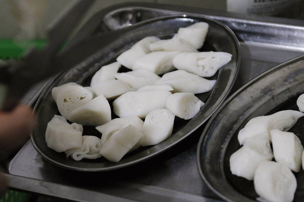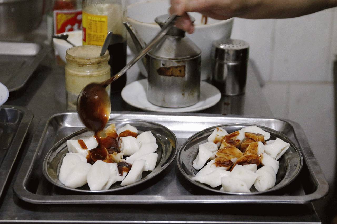 手法娴熟的老板娘,快速剪好猪肠粉装碟,再淋上秘制的甜酱和撒上一些芝麻~