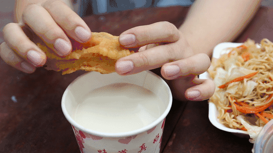 老婆婆炸的油条,结实脆口,豆浆也有股很清爽的黄豆味,掰一掰,蘸一蘸,不得不感叹豆浆配油条的美妙啊。