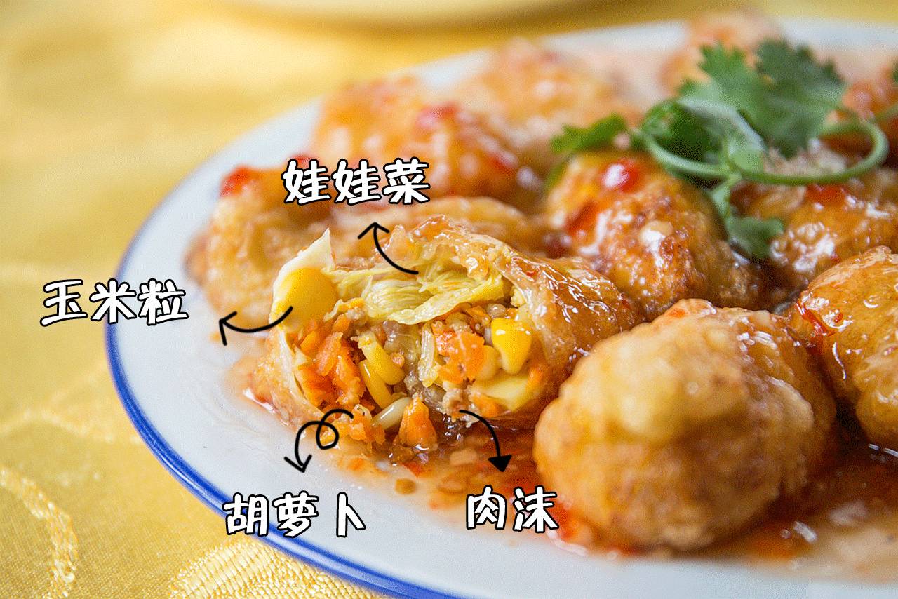 用娃娃菜包裹着:玉米粒、胡萝卜、肉沫