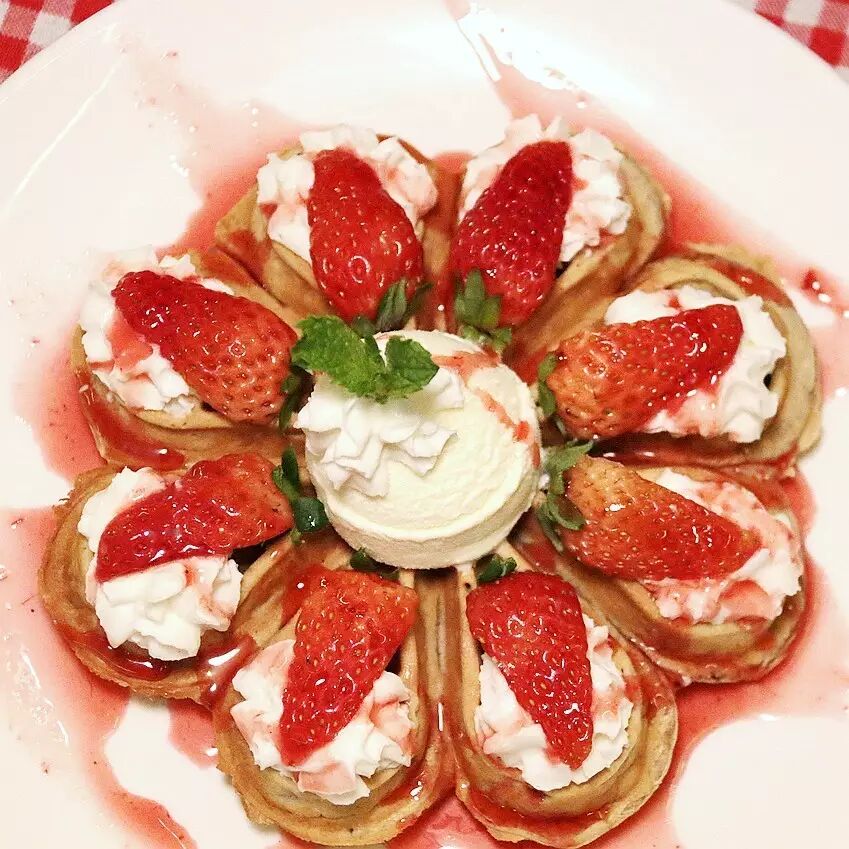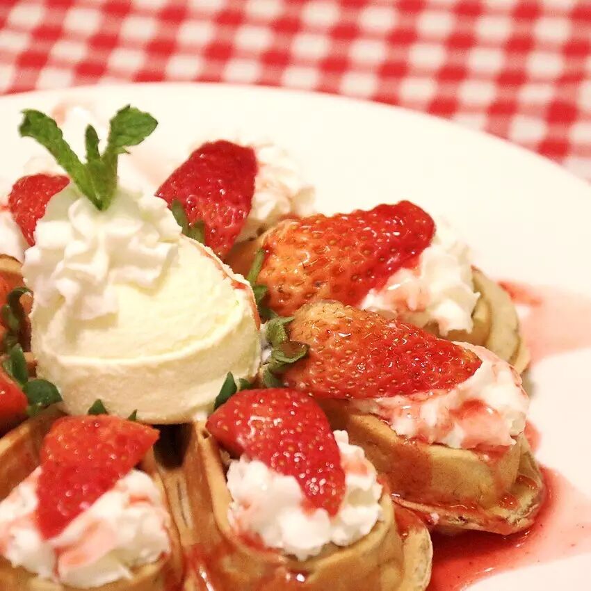 香甜的华夫饼配上白白的奶油和红艳的草莓,既可当早点又可在午后聚会时作为甜点奉上,真是好吃又养眼。奶油的柔软融合着华夫饼香脆再加上新鲜肉汁饱满的草莓,味道口感绝对超乎想象。