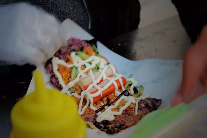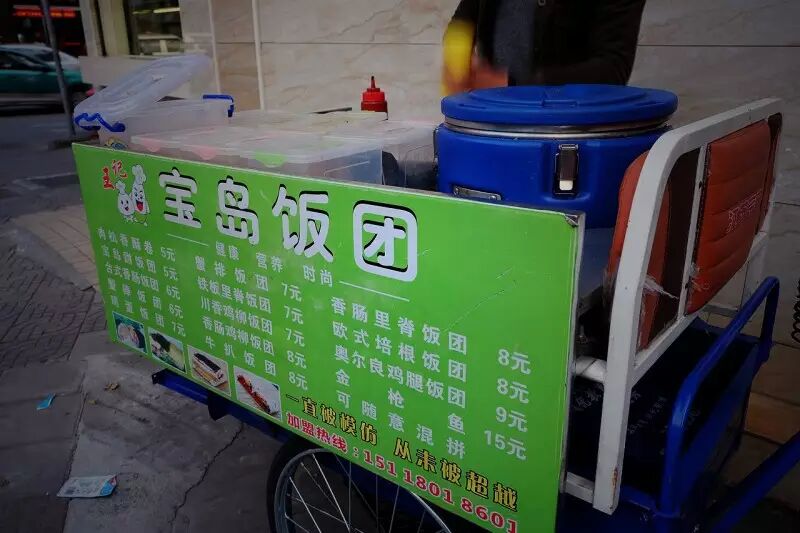 三中门口也有很多用小推车摆摊的小吃,煎饼果子和饭团是三中人最喜欢的2样小吃,饭团的口味多种多样,一般都是蟹棒的味道最受欢迎。