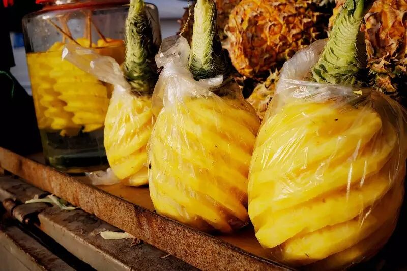 下午四五点,一位叔叔会准时在这条路上出现,卖起了老家的菠萝。贴心为客人削好皮,浸泡盐水,也许在别人眼中看来很不卫生,但是要比起外面食肆的封闭厨房来说,这些小摊档似乎要更加透明化。