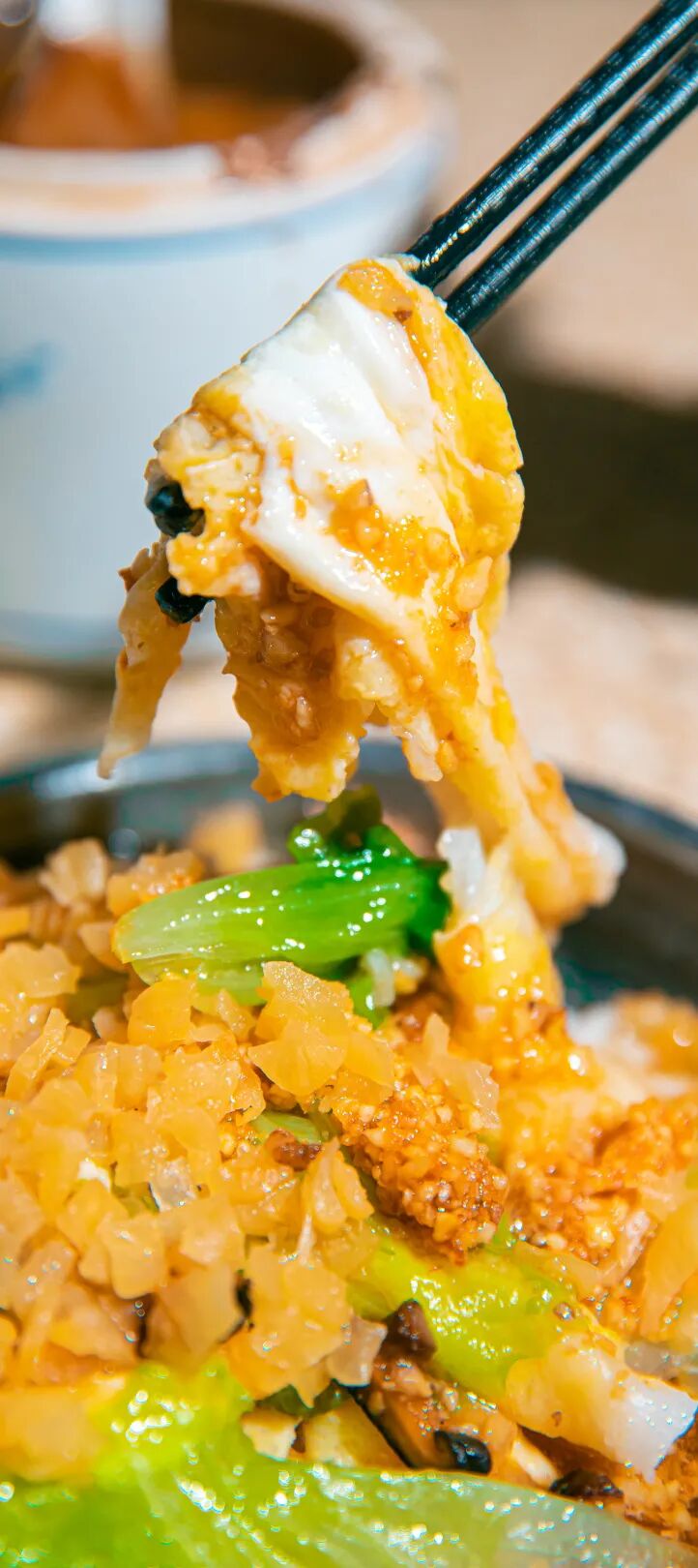 先喝一口汤,虾米调制的汤底鲜甜入味,暖意从喉咙涌入胃中。酿猪皮表层是炸过之后的猪皮蒸软和猪肉一起酿成,有着肉丸的脆嫩,炸猪皮还吸饱了汤汁,还是熟悉的味道!
