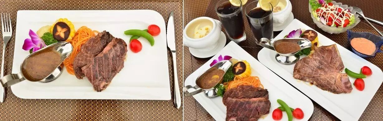 主食:安格斯牛仔骨、美式西冷牛扒(黑椒汁或红酒汁)