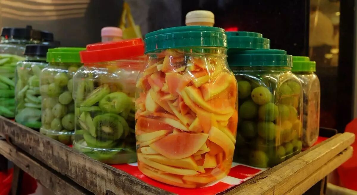 如果觉得自己吃歪腻了,走走停停,不自觉被路旁鲜艳多样的水果捞吸引,看着它们一片片新鲜的腌制过的水果宽横一致地躺在玻璃罐里,不妨称个一斤半两解解腻。