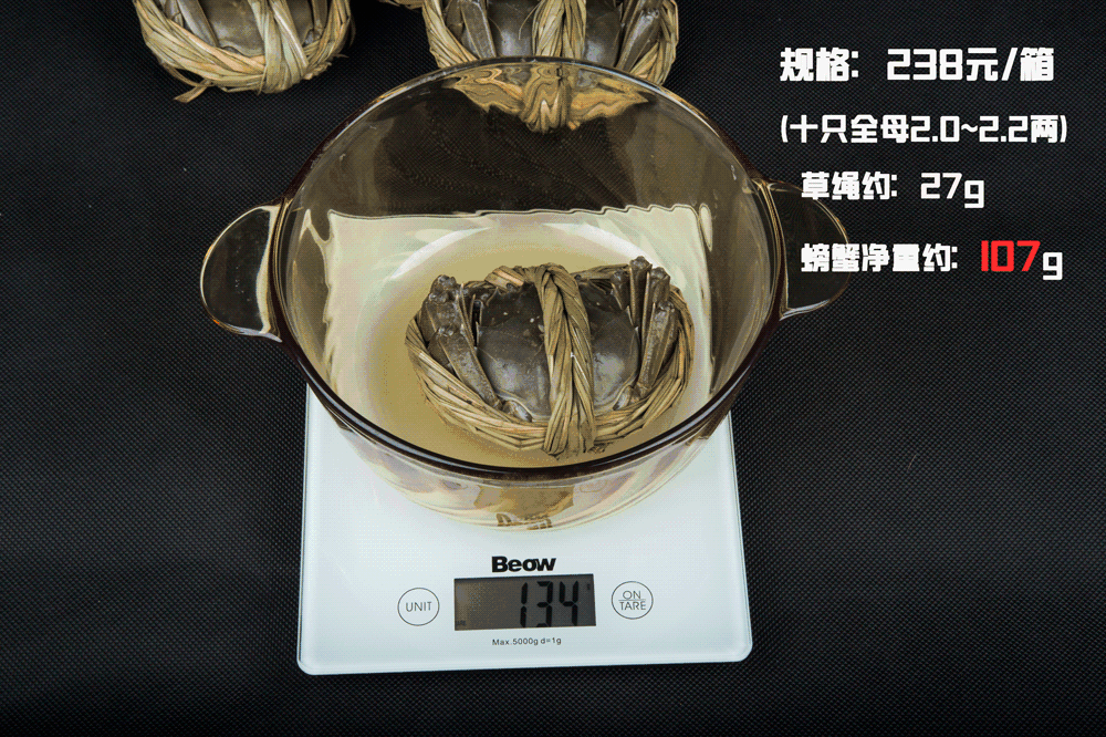 螃蟹的净重都是保质保量,规格为238元/箱的螃蟹,解绑前称重约为:2.68两,解绑后净重约为:2.14两,也是完美的保质保量。