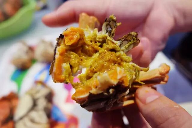 每一个螃蟹拿在手里,都有些沉沉的,肚子上的蟹壳也是看得见的饱满,小编按耐住了来一个螃蟹刺身的冲动,毕竟让一个吃货忍住食欲是一件不太人道的事情。
