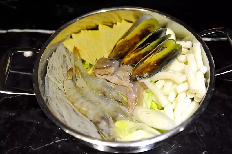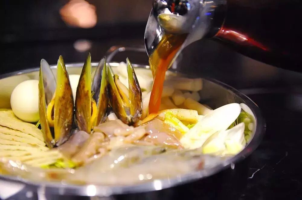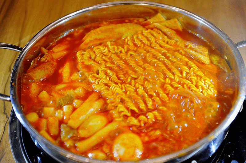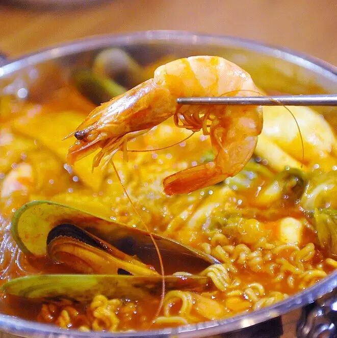 倒好酱汁,上桌开煮。看着眼前的食材浸入到浓浓汤汁中,慢慢变色、柔软…..沸腾后,放进韩国拉面,这拉面绝对是抢手货,吸收汤汁之后,香辣有劲道,怎么都吃不够!