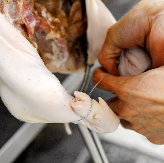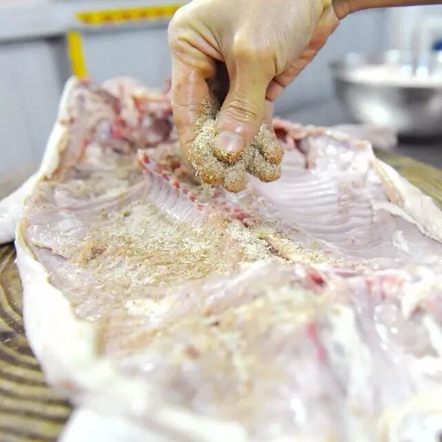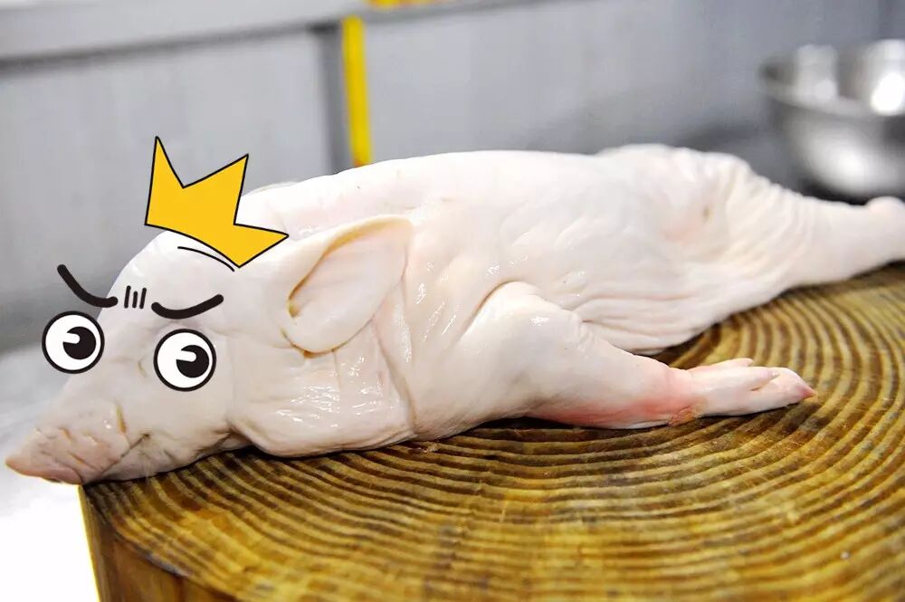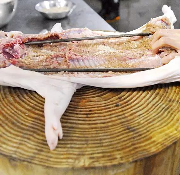 ▼从广西博白千里迢迢来的小乳猪,一般是5-6斤重,腌制前先验明正身,保证没有破损、斑点,白白嫩嫩才是靓猪仔呢。