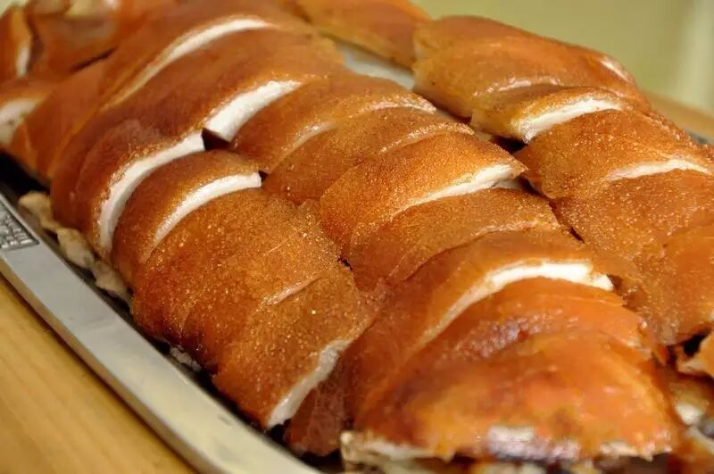 ▼乳猪拿去切片了,烤过后的乳猪,脆脆的猪皮是最大卖点。烤乳猪可以蘸白砂糖或特制蘸料,都别有风味。