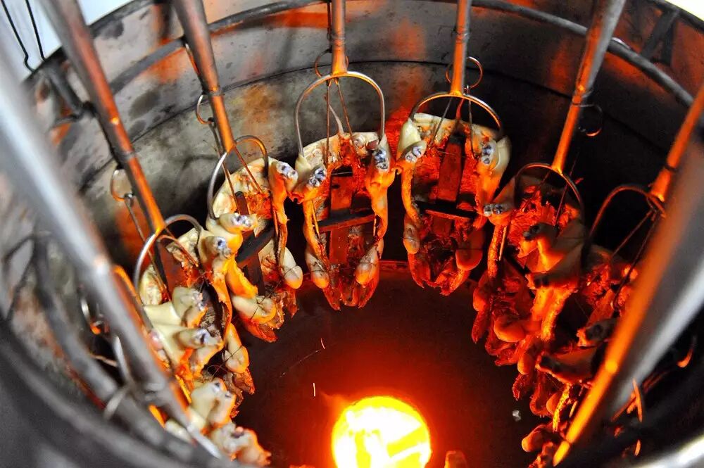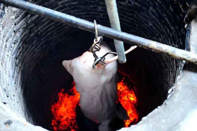 ▼眼前的大火炉,还没靠近就感受到一大股热力喷出来。腌好的乳猪要在这水深火热的炉中,待上40-50分钟才能出来,馋人的美食果然需要耐心等待。