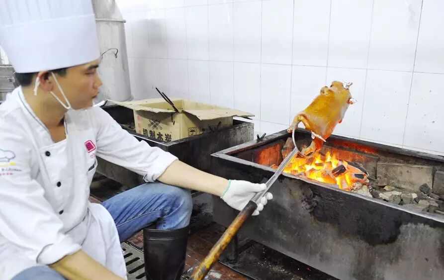 ▼烤乳猪的手法和火候,直接影响了乳猪的出品,烤时一定要勤转动,才能达到色泽均匀的效果。