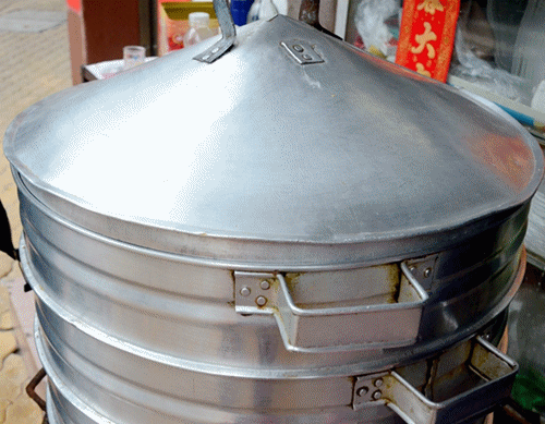 店门口还放着一个大蒸笼,忍不住好奇,掀开盖子,看看每一层分别放了些什么:蒸米丝——糯米饭——艾粄、猪脚醋,错落在每一层蒸架里。