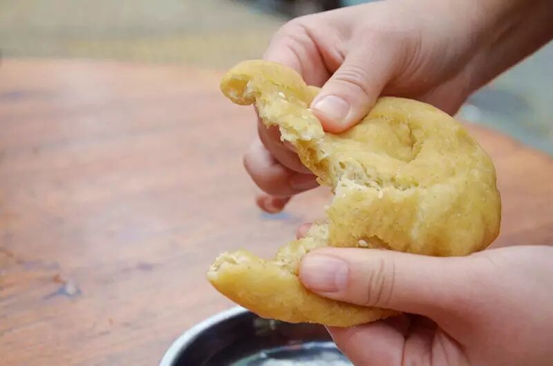 既然有粥,那就少不了炸油饼,用手撕成小块,准备放进粥里。和油条相比,油饼虽然炸得不够通透脆香,但胜在厚实,吃起来也更有嚼劲。