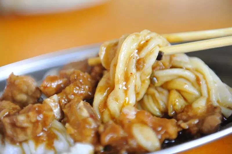 ▼肠粉蒸好后,将排骨连肉带汁淋在肠粉上。其实对于肠粉本身,只要入口不要太软绵就好,当然,如果能做到爽滑带韧劲,配上这浓郁的排骨酱汁,就完美了 。