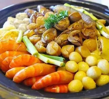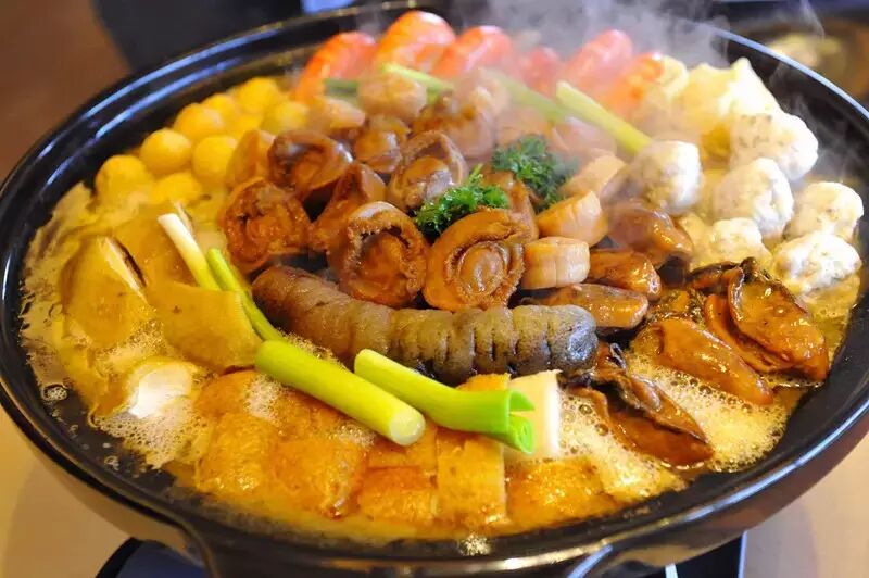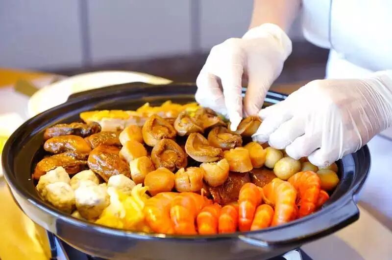 中间放置鱼肚、肉丸、鹌鹑蛋、烧腊,一些事先烹饪好的熟食,香味扑鼻而来,加热之后,因为有这么多食材一起烹煮,肉汁互相渗透。