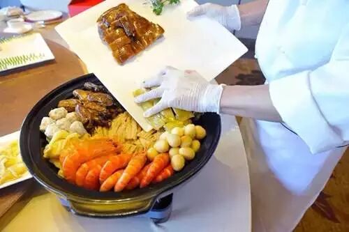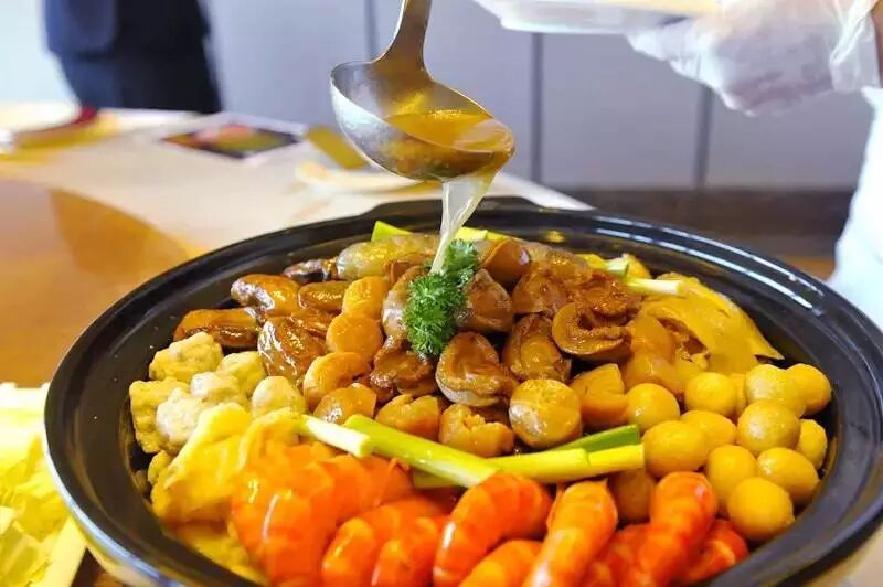 过年吃盆菜,似乎已经超越了味觉上的快乐——一个靓盆菜内有材料20多种,先由厨艺经验丰富的厨师烹煮各种食材,再将各种材料一层一层地叠放进大盆中。