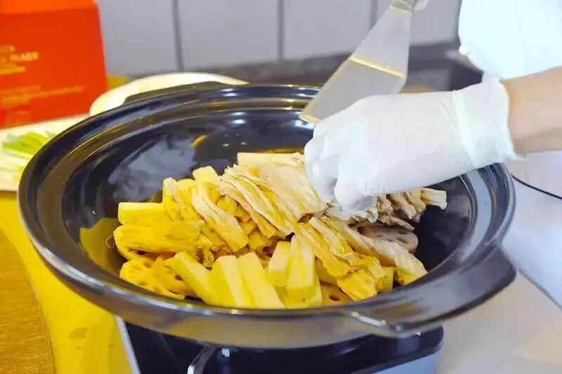 最下层放淮山、腐竹、蘑菇…..这几样食材最容易吸收肴汁,开煮后慢火熬炖,吃到最后全吸收了鸡汁浓汤和各种肉类海鲜的精华,味道升级了不止一个档次啊!!