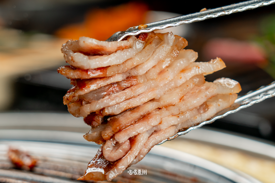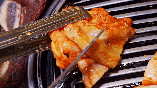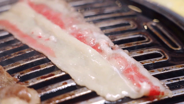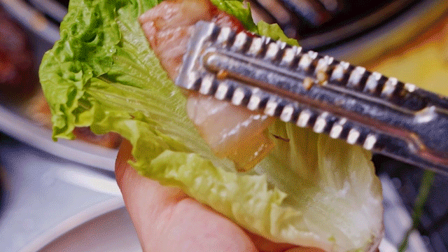 五花肉,烤肉界的MVP,焦黄酥脆是它最好的状态,搭配生菜、大蒜一起下口,完全停不下来,就是吃完不太适合约会而已。
