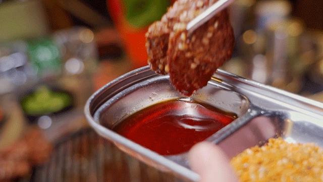 韩国综艺里经常cue到的牛胸叉,据说是胶原蛋白最丰富的部位。放上烤炉仅2秒就爆汁,牛肉鲜嫩,脂香浓郁,这口感…我三两下就能结束战斗。