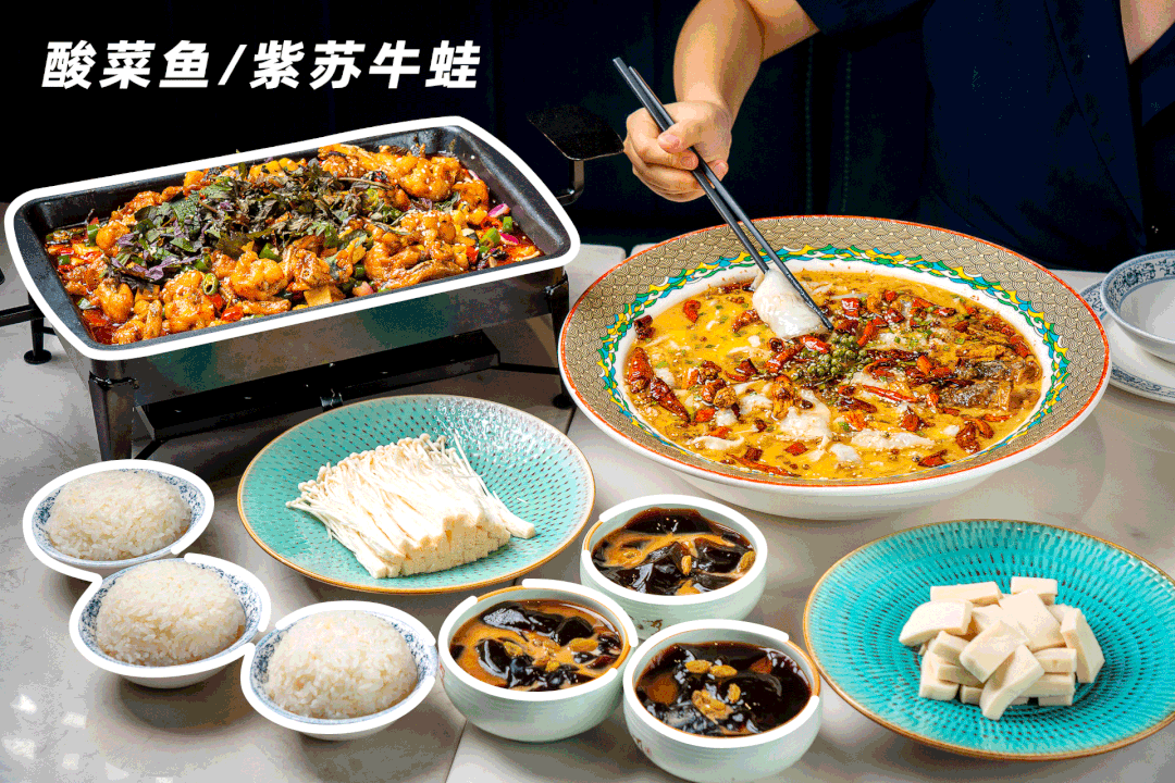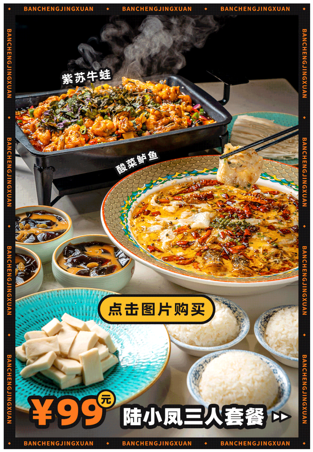 原价235元的三人套餐,限时只要99元。摊下来人均30+,就能吃上一份酸菜鱼/紫苏牛蛙,还赠送米饭和冰粉,轻轻松松吃一顿大餐无压力。
