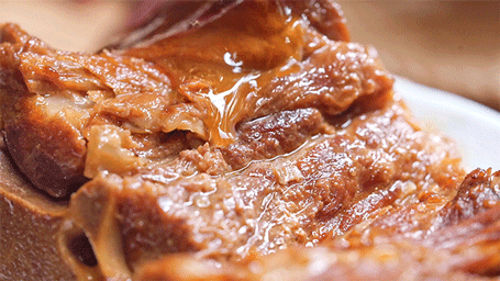 经过卤汁炖煮的酱大骨,软烂不柴,连骨头都很入味!吃它直接上手,掰开就能感受到肉筋相连,酱香四溢。