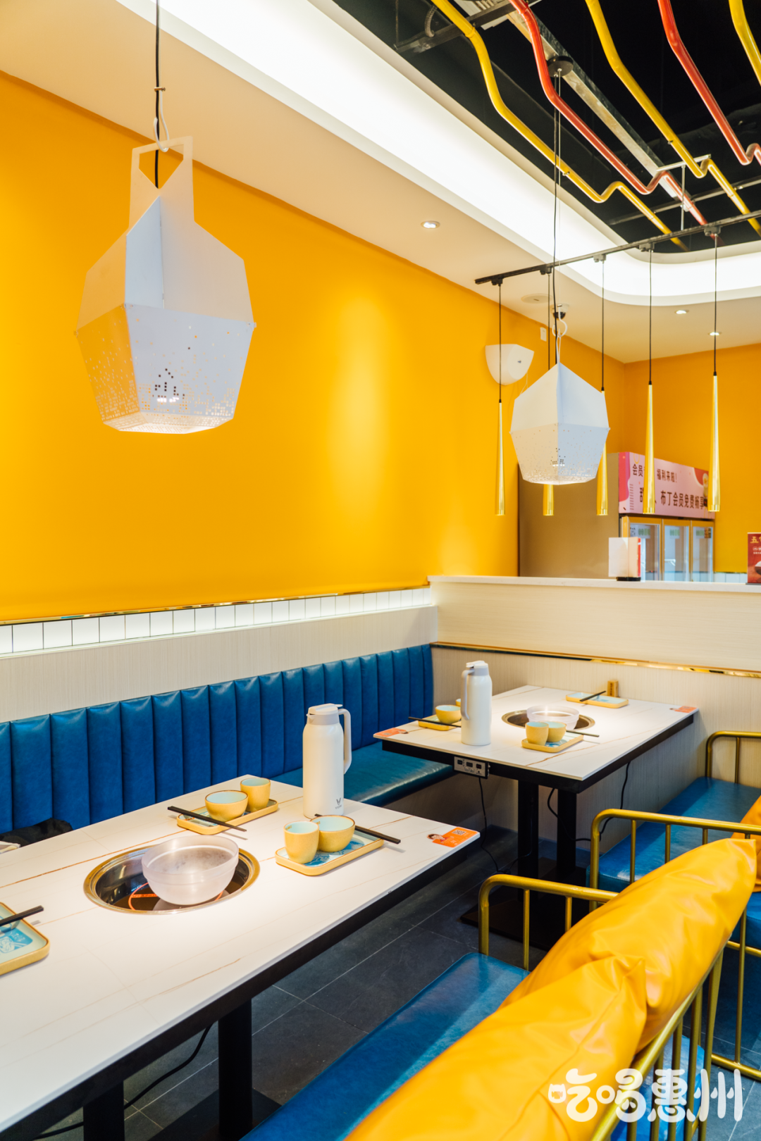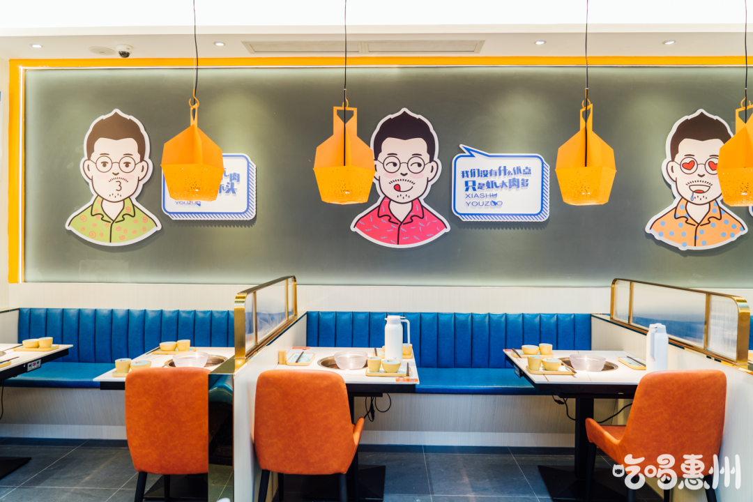 它是虾叔有座,半年内连开3家,新店开在隆生金山湖5楼。不同以往的装修风格,这次选用黄蓝色系搭配,从品牌形象到门店环境都颠覆传统。