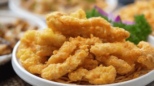 光是这金灿灿的外表就令人口水直流,鱼翅经过油炸后外酥里嫩,还保持着厚实的肉质,搭配椒盐后的咸香酥脆,真叫人欲罢不能!