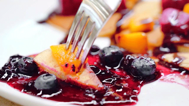 松松软软的松饼摆成好看的造型,淋上香甜的巧克力酱和五光十色的新鲜水果,吃起来简直不要太幸福!