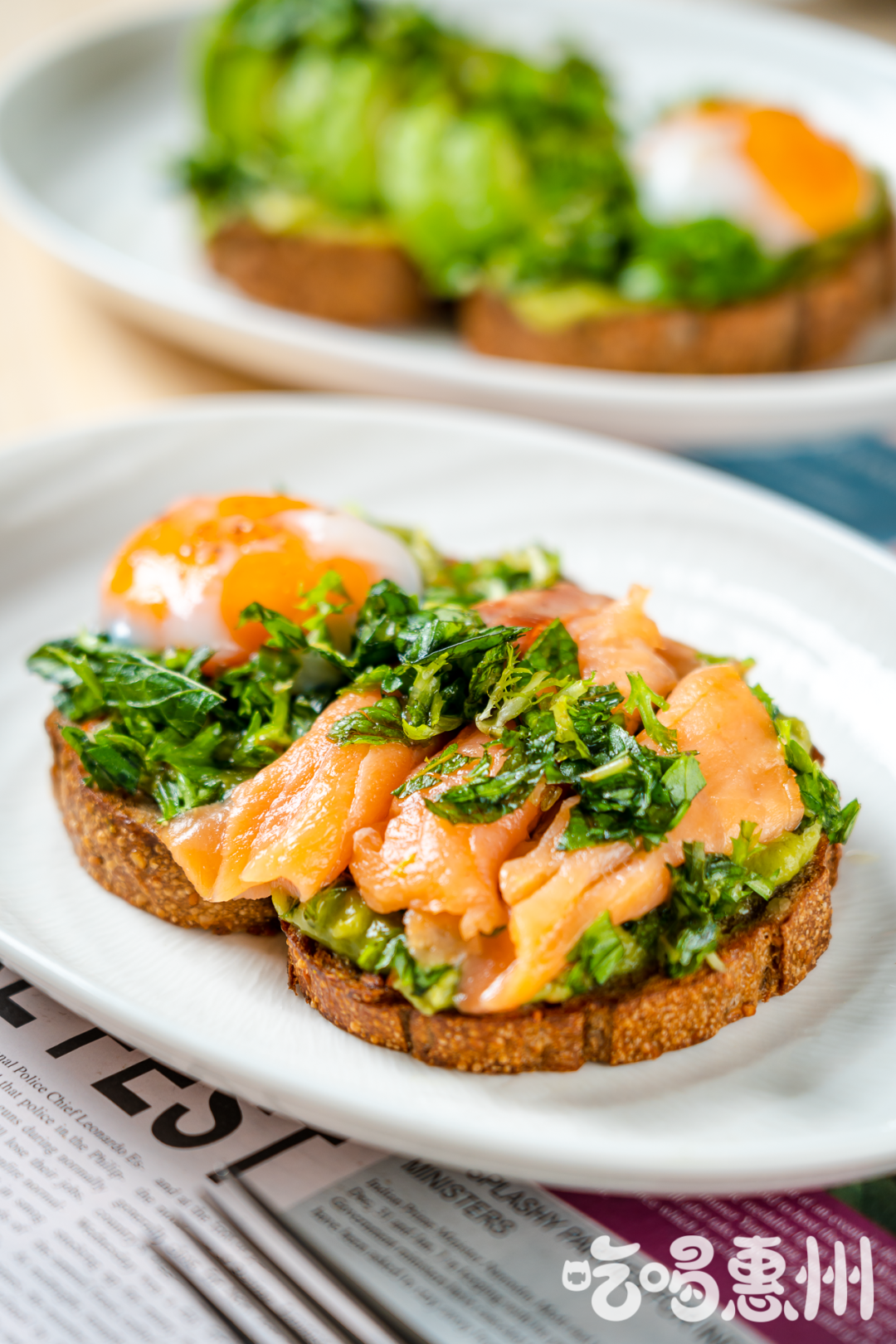 温泉蛋吐司除了牛油果还有三文鱼口味,牛油果酱综合三文鱼的咸味刚刚好,搭配自制的拌香草,着实有被惊艳到。