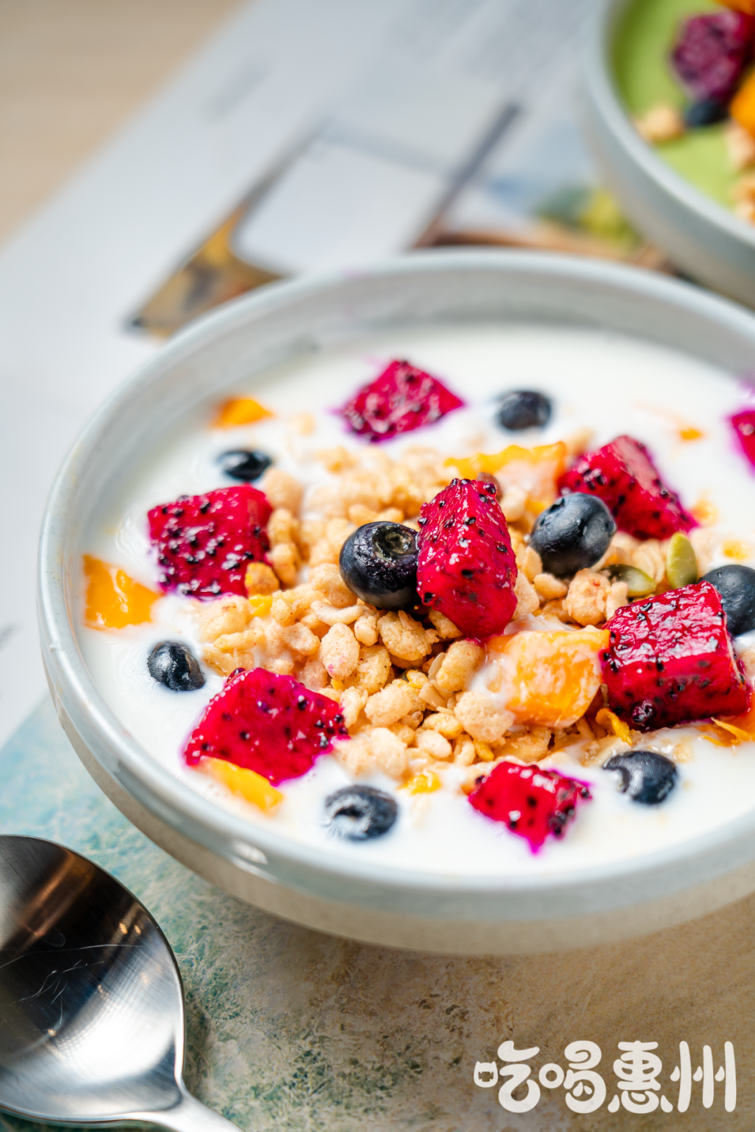卡士酸奶打底的奶昔,稠厚度适中,撒上脆脆的水果麦片,再点缀上新鲜的蓝莓、芒果、红心火龙果,酸甜清新,吃到嘴里一层甜一层脆,层次感丰富,摄影师一口气消灭了一整碗…