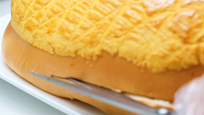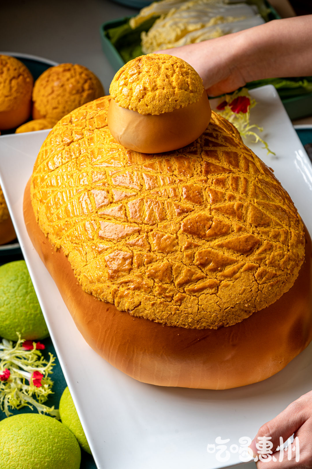 巨制特大菠萝包,做一个要花上40分钟。上桌时被热气顶到鼓鼓的,切开的瞬间烟雾全部跑出来,拉开满是芝士拉丝。这一整个过程下来,简直是味觉和视觉的双重享受。