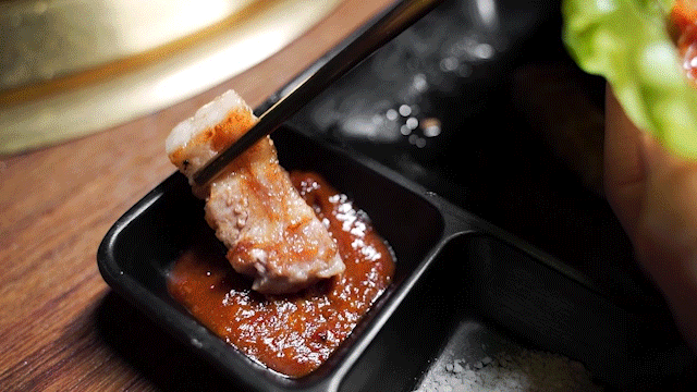 老板告诉我们,五花肉包着生菜更好吃。一块肉、一片腌制过的洋葱、一点泡菜、再蘸点虎哥六秘制烤肉酱一起塞入口中,不要咬断才是重点!