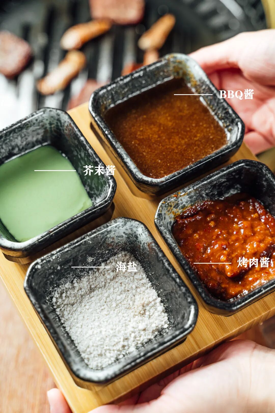 每桌消费的顾客都会标配4种酱料+8款小菜(根据季节更换)。每种烤肉都有不一样的吃法,贴心的服务员会告诉你怎么搭配更好吃。对了,小菜还可以免费续哦,怪不得有人说吃他家的小菜都能吃饱~
