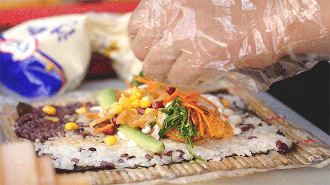 饭团有紫米和白米可选择,加3种肉只需8元,蔬菜免费!店家熟练得将各种材料包起来,还加入了沙拉酱、玉米粒和黄金豆,口感特别丰富。