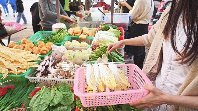 从满满的食材中挑出喜欢的菜,再加上一块面饼,就可以打包拎回宿舍享受啦。装碗时还会加入一些蒜末增香,味道清淡,可以吃到食材最原本的鲜味。