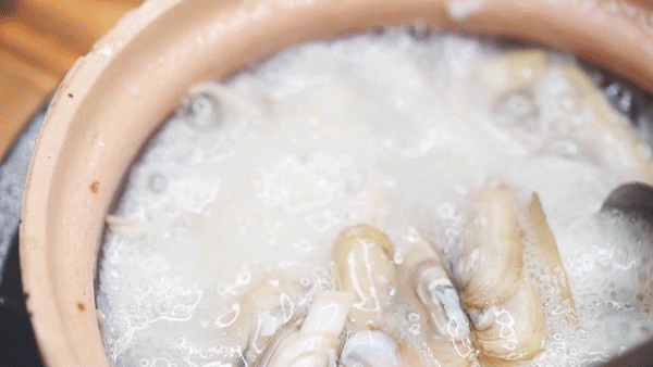 第一个下锅的必须是它!来自贝类的清甜,为粥底增添了一股恰如其份的味道,使得它更加的浓郁鲜香。下锅只需要1分钟,烫熟的白贝便如开花般在粥底里绽放开来。
