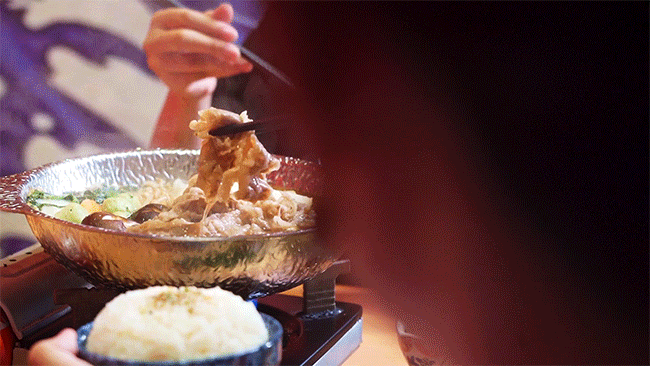 寿喜烧在酱汁的沸腾中氤氲着馋人的香气,趁热夹起,微微烫口的牛肉在舌尖肆意缠绵。肉香缓慢融化,咬下去的刹那满足感爆棚!