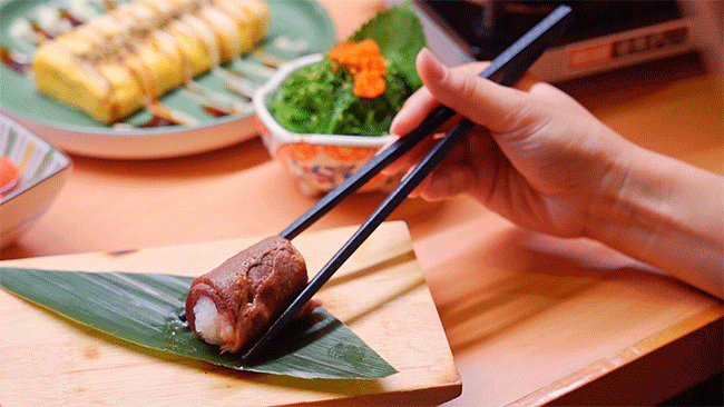 上桌自带火焰表演的澳洲和牛火炙寿司,每一个动作都仿佛是艺术一般,精雕细琢,打磨出这份寿司的美味。
