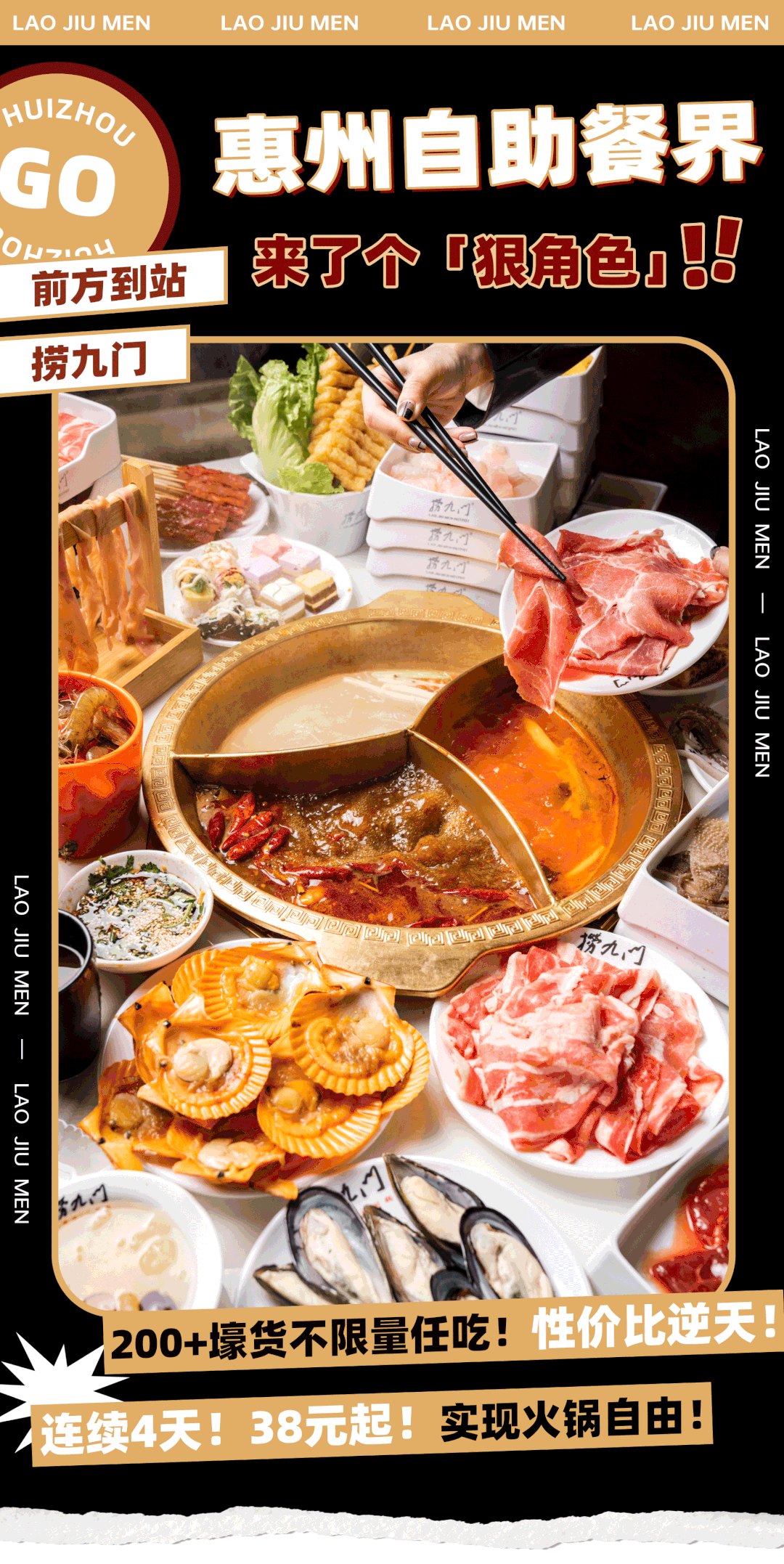 仲恺吃货们有福了!高人气高品质的「捞九门」开到了天益城二期6楼。壕无人性的火锅+无限量自助。连续4天38元起,赶紧清空肚子内存,带上256G胃容量吃到爽!