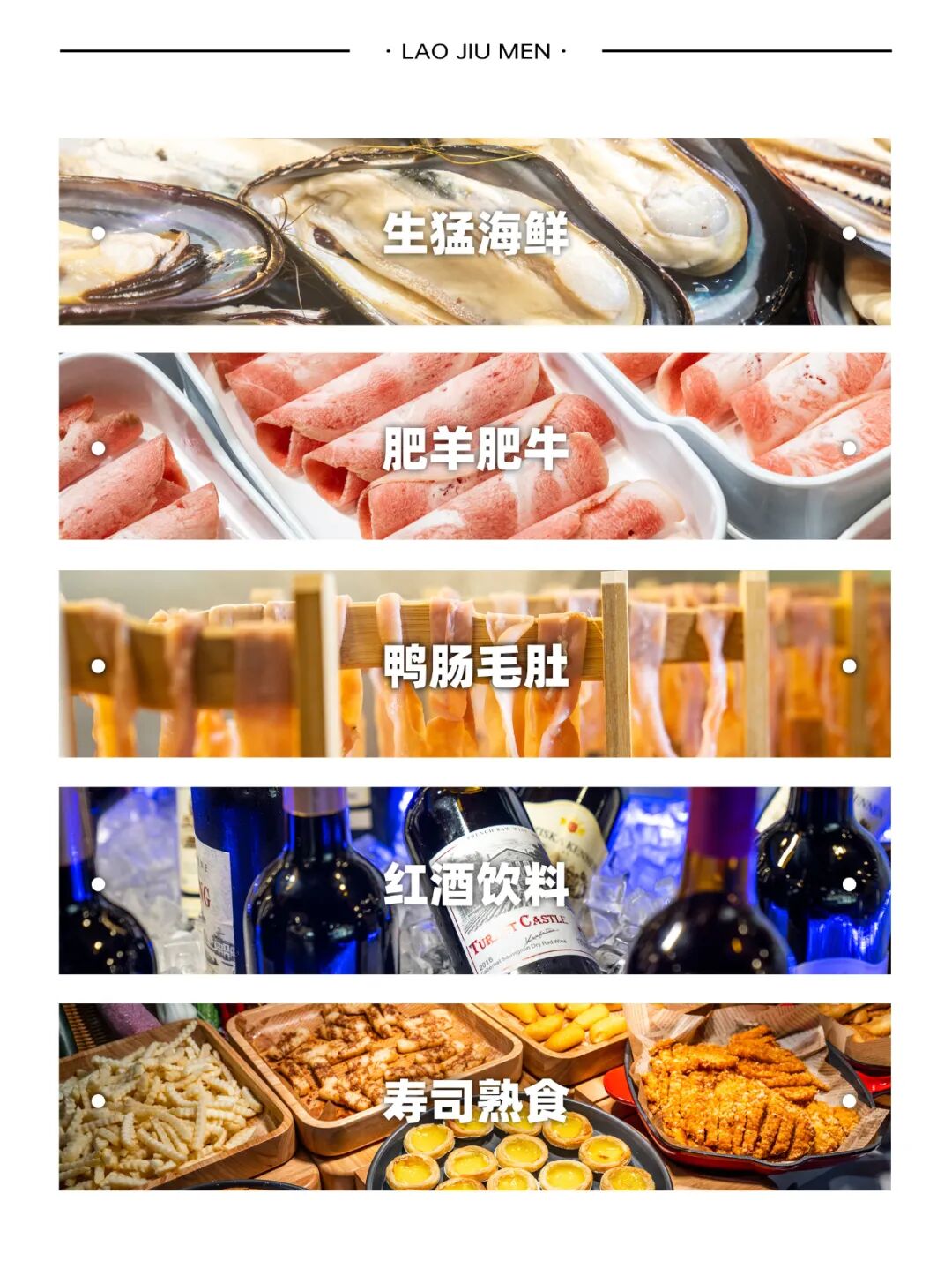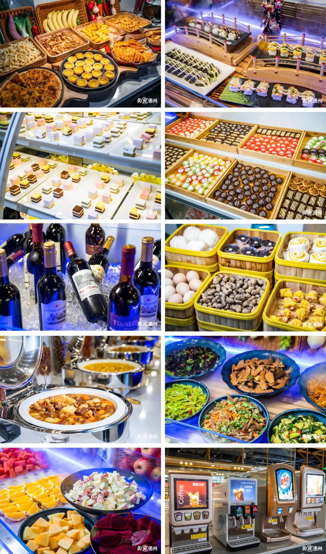 海鲜肥牛、毛肚肉类、寿司点心、凉菜熟食、小吃水果、红酒饮料任吃任饮,20+个美食区域,200+个品种!如此齐全丰富,不吃过瘾绝不回家。