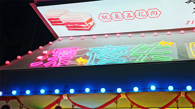 店内有很多霓虹装饰,配合着夜色,进入后有一种穿越的迷幻感,给食客感受别具一格的魅力。晚上睡不着也没关系,因为深夜失眠烧烤的霓虹灯就在等你。