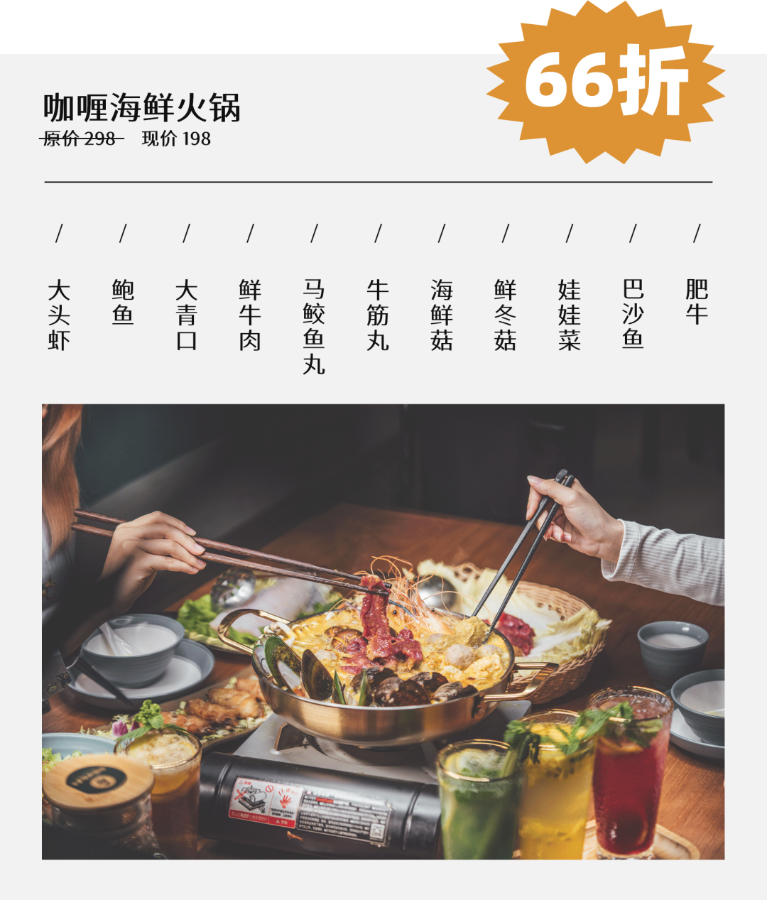 除了这些,还有鲜牛肉、马鲛鱼丸、牛筋丸、海鲜菇、鲜冬菇、巴沙鱼、肥牛…想要吃得体面,钱包又不会疼,选它准没错,现在还有66折,折后价格很美丽,人均49.5元即可拥有。