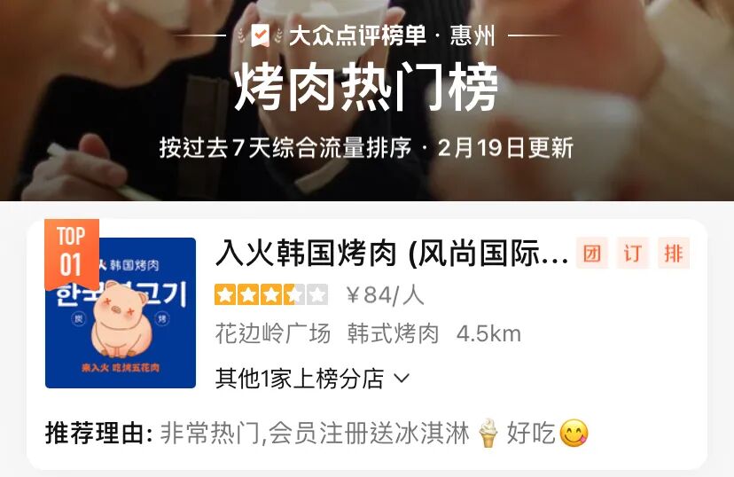 它有多牛,用数据说话!如果你打开某点评的惠州烤肉热门榜,就会发现它常居NO.1!害,这大概就是实力吧~