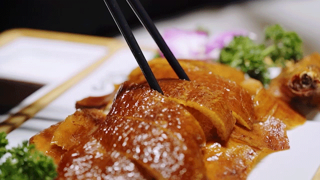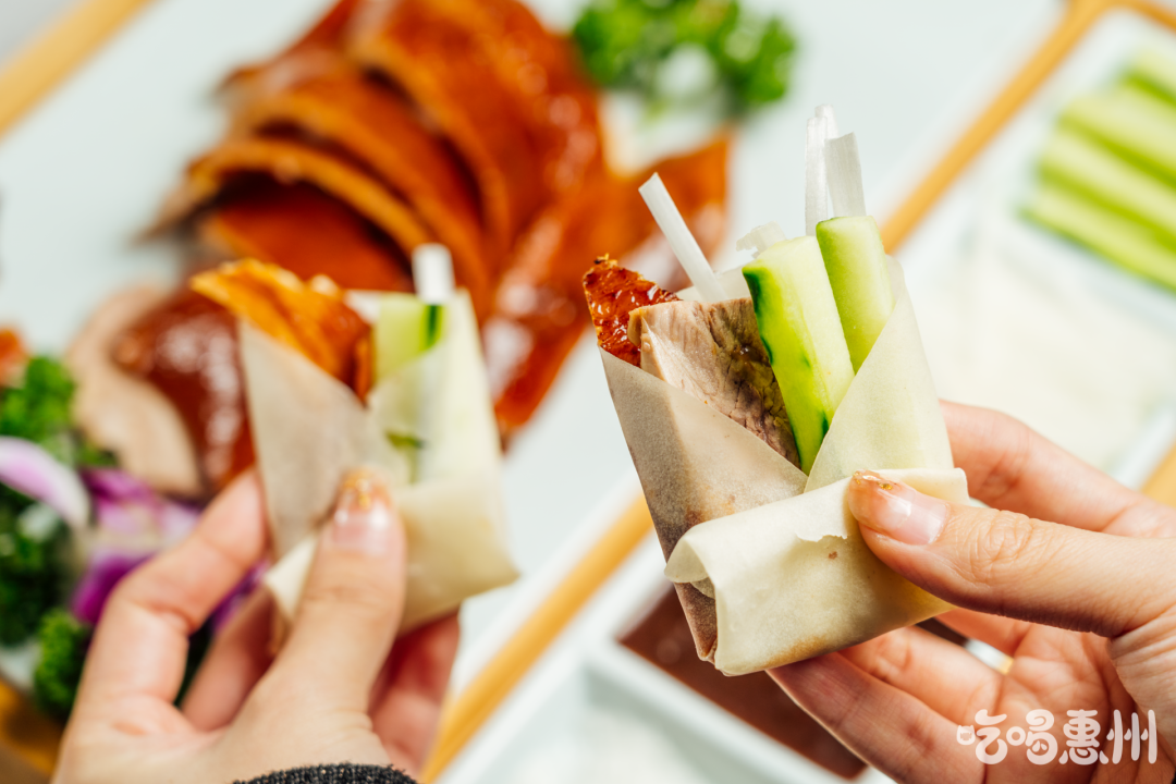 烤鸭皮蘸上甜面酱,卷上葱丝和黄瓜一起,用荷叶饼包裹着吃,是它的标配吃法。不必在意卷得是否美观,速度快才是王道,不为别的,就怕你抢不过同桌的人。