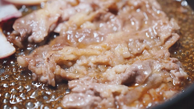 原来寿喜烧不是火锅啊。要吃它,得先煎肉。先开火把黄油加热融化涂开,再放入大葱、洋葱,然后迅速放入牛肉。肉快熟时倒入店里秘制的酱汁,就大功告成啦!