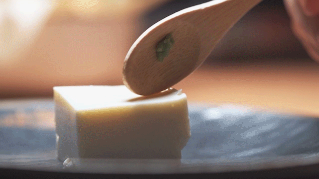 同样加了牛乳的豆腐,吃起来不仅有豆香,更有芝士的香味。冰冰甜甜的豆腐,沾上芥末,口感变得更丰富了。