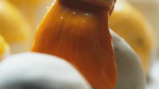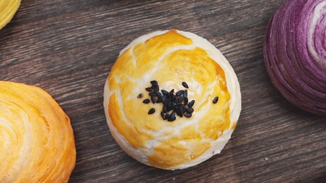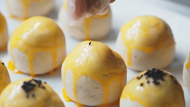 经过层层包裹,再刷上金黄的蛋液,然后放入芝麻点缀,一颗活脱脱的蛋黄酥就诞生啦~接下来就是等待进入烤箱。