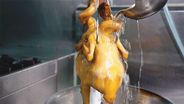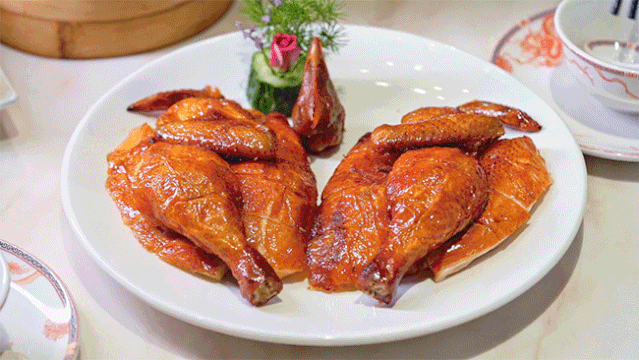 一般都是整只上桌,要切开记得提前和店员说哦~烧鸡皮被烤得金黄酥脆,灯光下,还泛着油光。在美团/大众点评上下单,9.9元就能吃到一只啦!